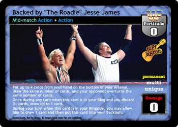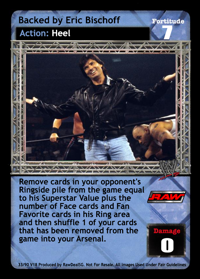 Shuffle 1 card with Stun Value from your Ringside pile into your Arsenal and draw 1 card. When this card is in your Ring area, the player with the highest Stun Value in his Ring area may play his cards with Stun Value at -#F, where # is equal to the Stun Value in his Ring area.