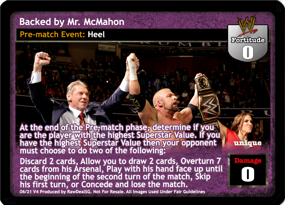 At the end of the Pre-match phase, determine if you are the player with the highest Superstar Value. If you have the highest Superstar Value then your opponent must choose to do two of the following: Discard 2 cards, Allow you to draw 2 cards, Overturn 7 cards from his Arsenal, Play with his hand face up until the beginning of the second turn of the match, Skip his first turn, or Concede and lose the match.