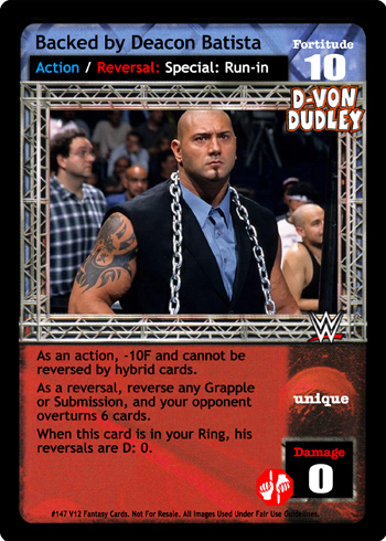 As an action, -10F and cannot be reversed by hybrid cards. As a reversal, reverse any Grapple or Submission, and your opponent overturns 6 cards. When this card is in your Ring, his reversals are D: 0.