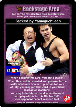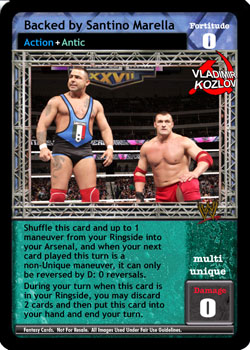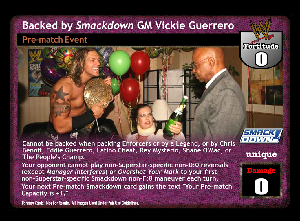 Cannot be packed when packing Enforcers or by a Legend, or by Chris Benoit, Eddie Guerrero, Latino Cheat, Rey Mysterio, Shane O'Mac, or The People's Champ. Your opponent cannot play non-Superstar-specific non-D:0 reversals (except Manager Interferes) or Overshot Your Mark to your first non-Superstar-specific Smackdown non-F:0 maneuver each turn. Your next Pre-match Smackdown card played gains the text 'Your Pre-match Capacity is +1.'