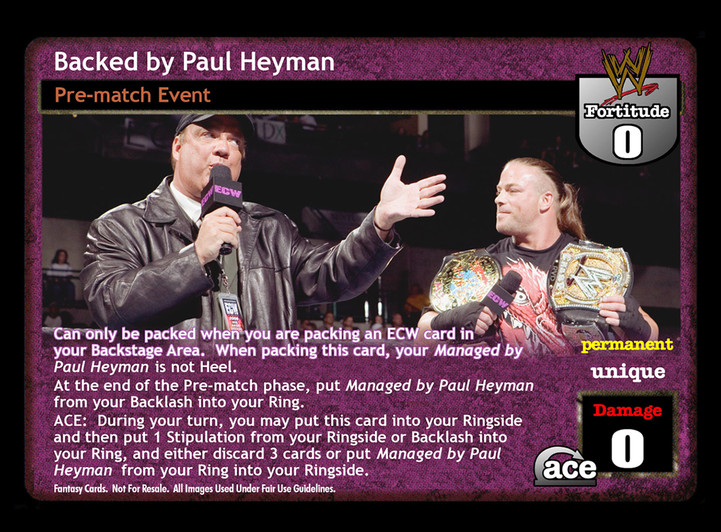 Can only be packed when you are packing an ECW card in your Backstage Area. When packing this card, your Managed by Paul Heyman is not Heel. At the end of the Pre-match phase, put Managed by Paul Heyman from your Backlash into your Ring. ACE: During your turn, you may put this card into your Ringside and then put 1 Stipulation from your Ringside or Backlash into your Ring, and either discard 3 cards or put Managed by Paul Heyman from your Ring into your Ringside.