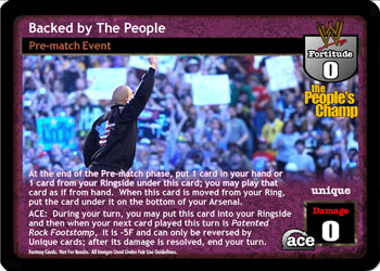 At the end of the Pre-match phase, put 1 card in your hand or 1 card from your Ringside under this card; you may play that card as if from hand. ACE: During your turn, you may put this card into your Ringside and then when your next card played this turn is Patented Rock Footstomp, it is -5F and can only be reversed by Unique cards; after its damage is resolved, end your turn. When this card is moved from your Ring, put the card under it on the bottom of your Arsenal.