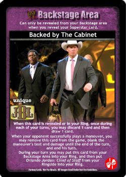 When this card is revealed or in your Ring, once during each of your turns, you may discard 1 card and draw 1 card. When your opponent successfully plays a maneuver, you may remove this card from the game, blank the maneuver's text and damage until the end of the turn, and end his turn. During your turn you may put this card from your Backstage Area into your Ring, and then put Orlando Jordan: Chief of Staff from your Ringside into your Ring.