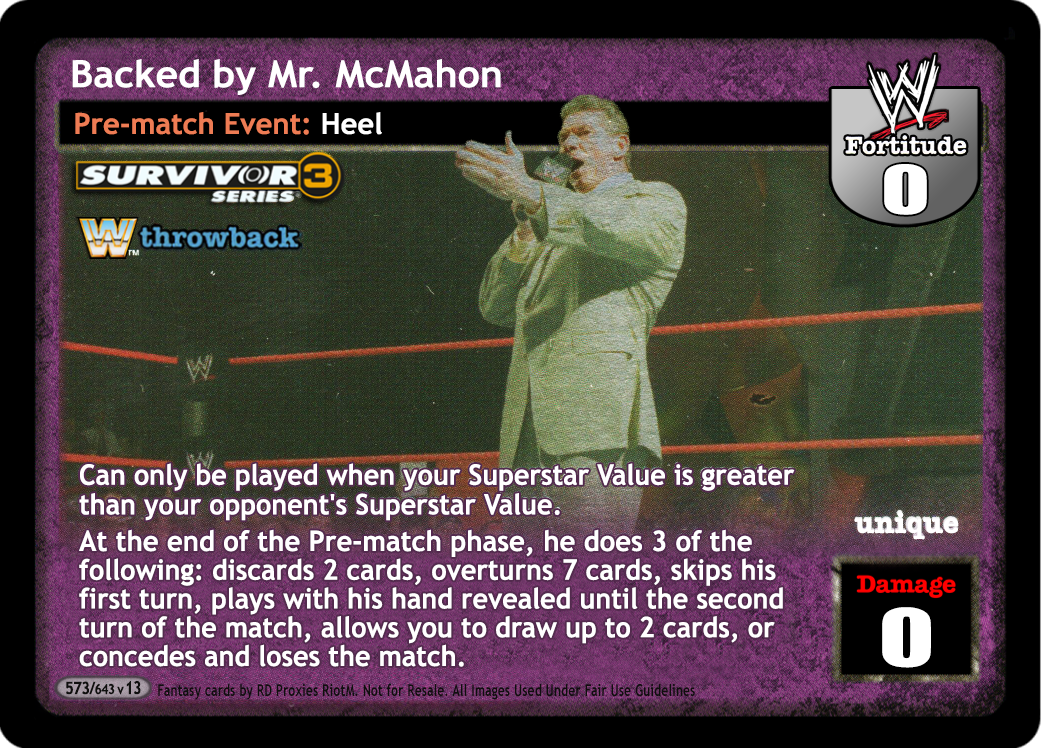 Can only be played when your Superstar Value is greater than your opponent's Superstar Value. At the end of the Pre-match phase, he does 3 of the following: discards 2 cards, overturns 7 cards, skips his first turn, plays with his hand revealed until the second turn of the match, allows you to draw up to 2 cards, or concedes and loses the match.