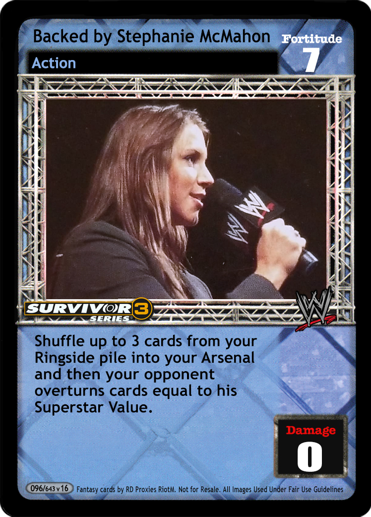 Shuffle up to 3 cards from your Ringside pile into your Arsenal and your opponent overturns # cards, where # is equal to his Superstar Value.