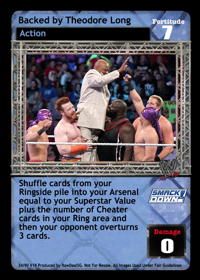 Shuffle cards from your Ringside pile into your Arsenal equal to your Superstar Value plus the number of Cheater cards in your Ring area and then your opponent overturns 3 cards.