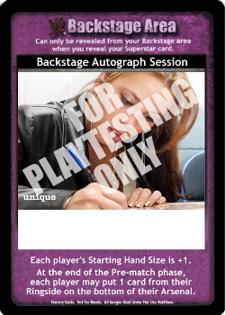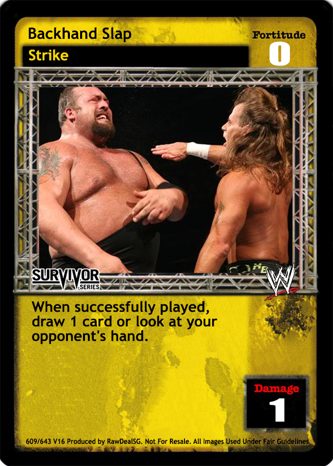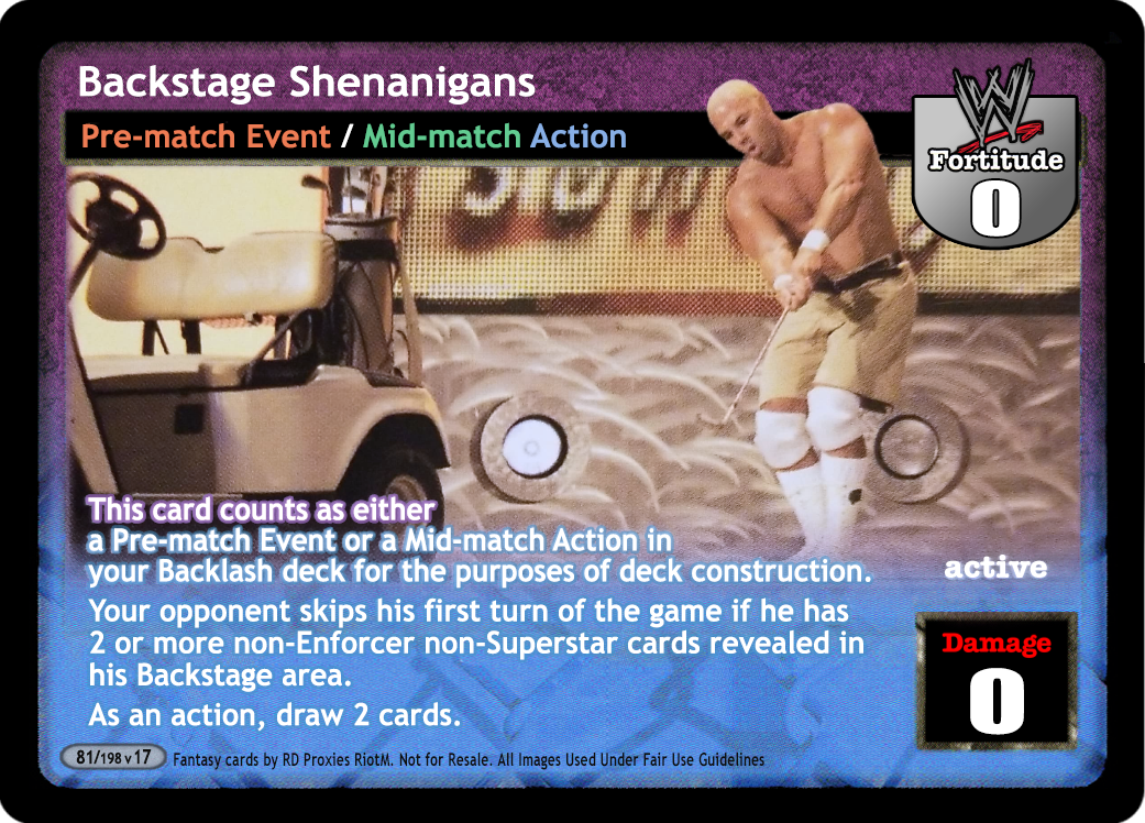 This card counts as either a Pre-match Event or a Mid-match Action in your Backlash deck for the purposes of deck construction. Your opponent skips his first turn of the game if he has 2 or more non-Enforcer non-Superstar cards revealed in his Backstage area. As an action, draw 2 cards.
