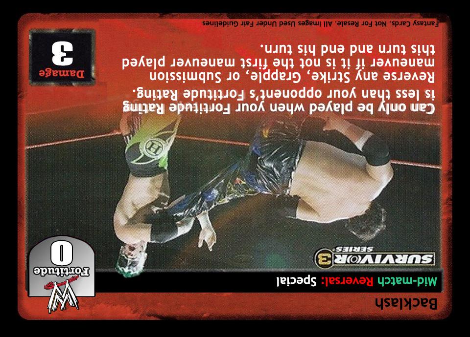 Can only be played if your Fortitude Rating is less than your opponent's Fortitude Rating. Reverse any Strike, Grapple, or Submission maneuver if it is not the first maneuver played this turn and end your opponent's turn.