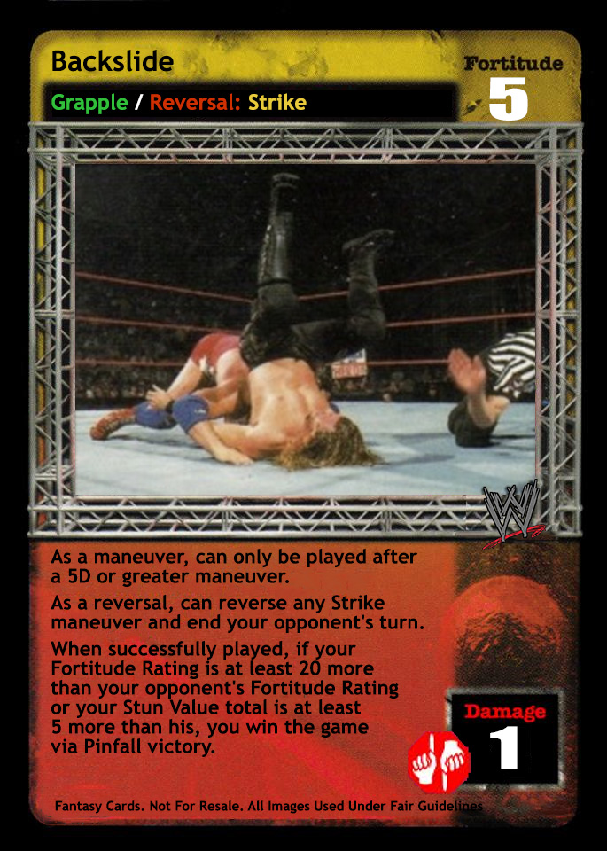As a maneuver, can only be played after a successfully played 5D or greater maneuver. As a reversal, reverse any Strike maneuver and end your opponent's turn. When successfully played, if your Fortitude Rating is at least 20F greater than your opponent's Fortitude Rating, or if the Stun Value in your Ring area is at least 5 greater than the Stun Value in your opponent's Ring area, you win the game via Pinfall victory.