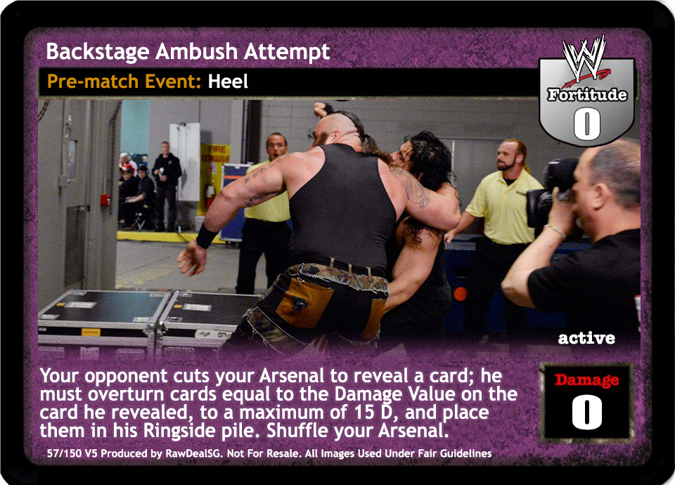 Your opponent cuts your Arsenal to reveal a card; he must overturn cards equal to the Damage Value on the card he revealed, to a maximum of 15 D, and place them in his Ringside pile. Shuffle your Arsenal.