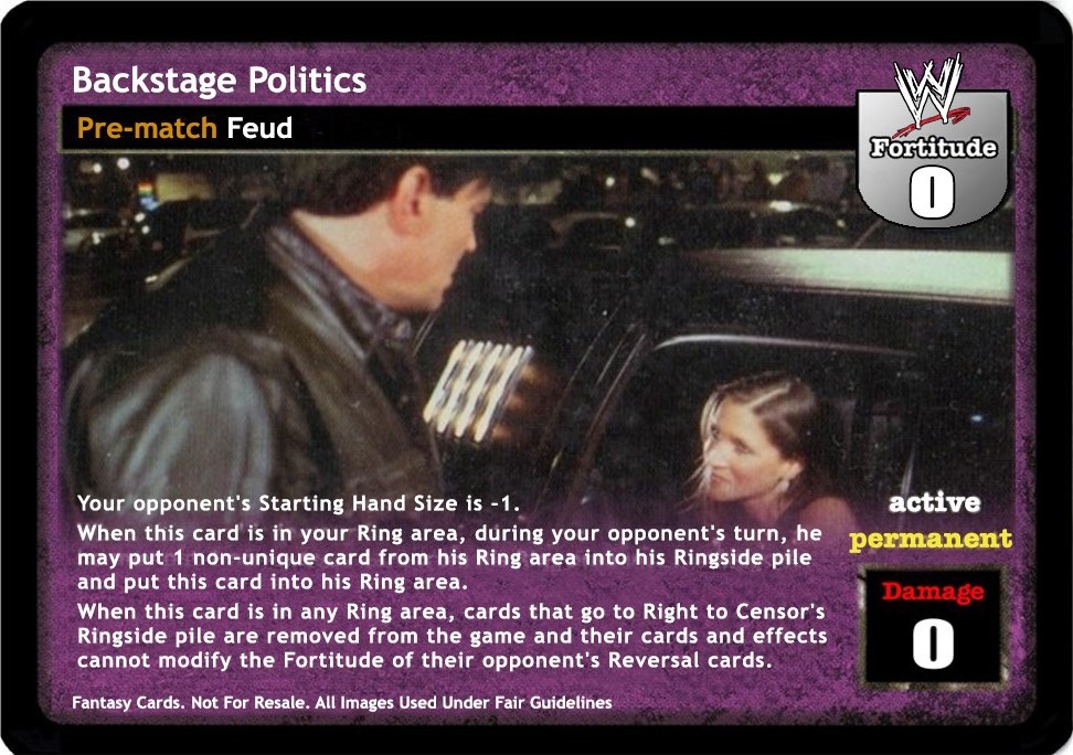 Your opponent's Starting Hand Size is -1. When this card is in your Ring area, during your opponent's turn, he may put 1 non-unique card from his Ring area into his Ringside pile and put this card into his Ring area. When this card is in any Ring area, cards that go to Right to Censor's Ringside pile are removed from the game and their cards and effects cannot modify the Fortitude of their opponent's Reversal cards.