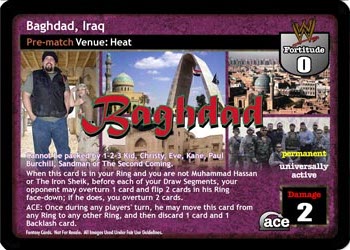 Cannot be packed by 1-2-3 Kid, Christy, Eve, Kane, Paul Burchill, Sandman or The Second Coming. When this card is in your Ring and you are not Muhammad Hassan or The Iron Sheik, before each of your Draw Segments, your opponent may overturn 1 card and flip 2 cards in his Ring face-down; if he does, you overturn 2 cards. ACE: Once during any players' turn, he may move this card from any Ring to any other Ring, and then discard 1 card and 1 Backlash card.