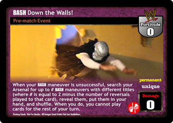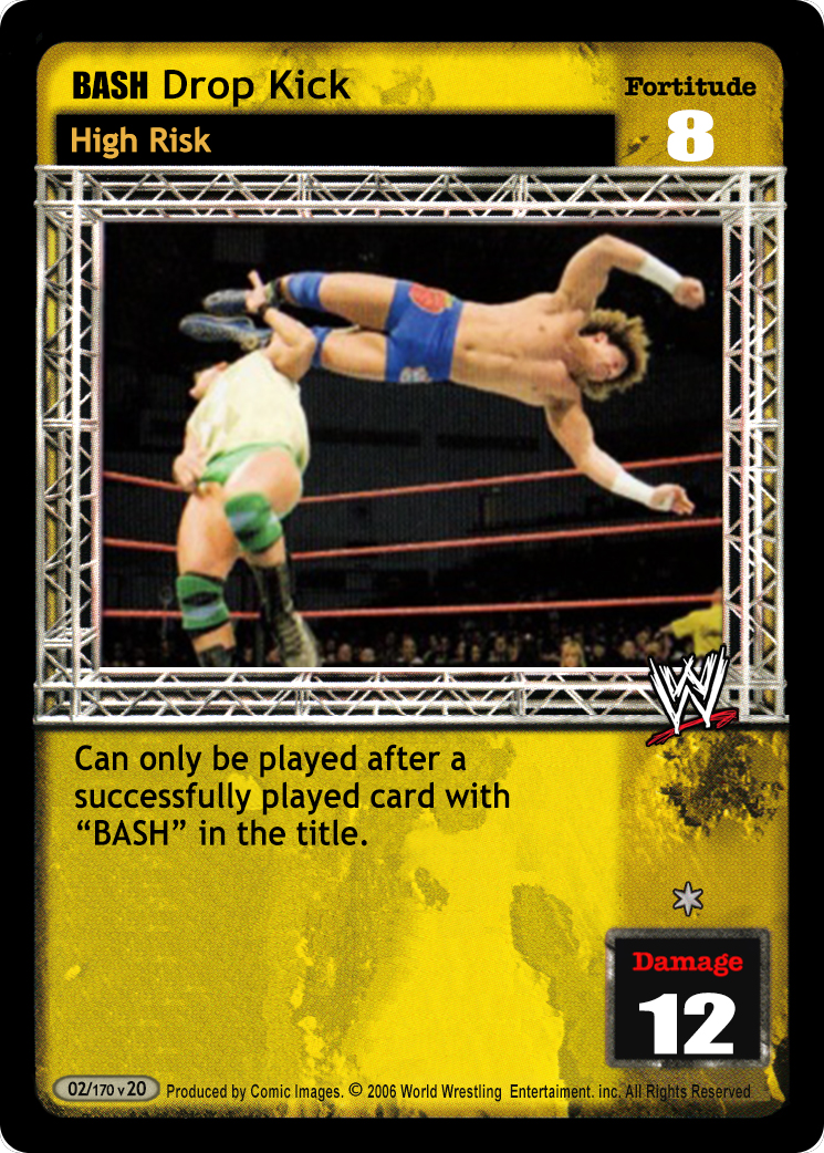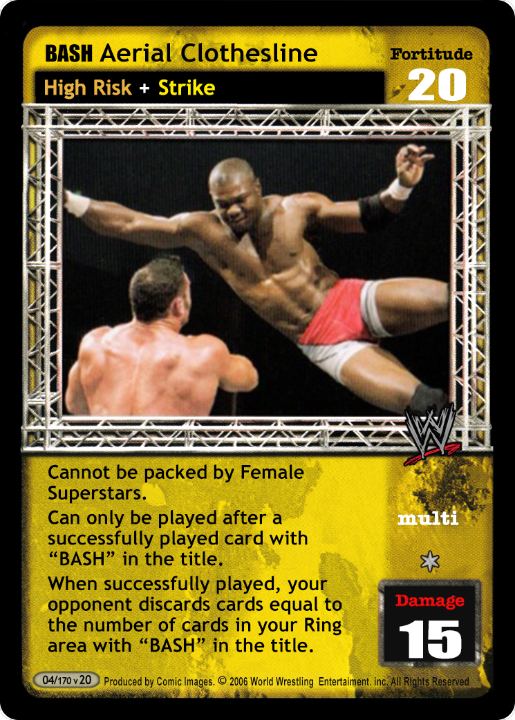 Cannot be packed by Female Superstars. Can only be played after a successfully played card with "BASH" in the title. When successfully played, your opponent discards cards equal to the number of cards in your Ring area with "BASH" in the title.