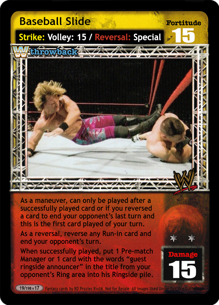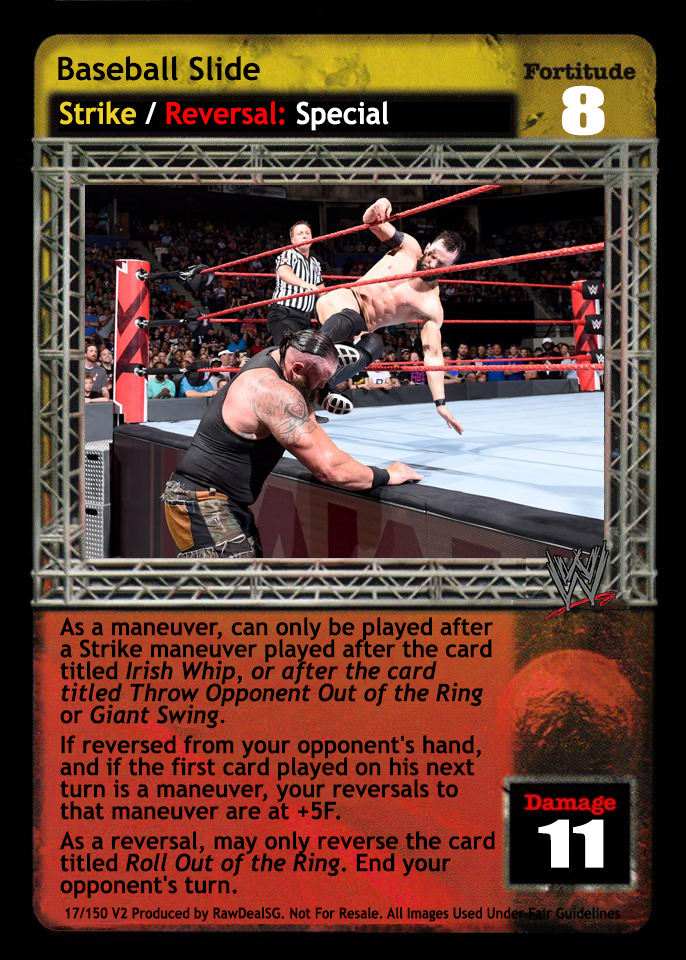 As a maneuver, can only be played after a Strike maneuver played after the card titled Irish Whip, or after the card titled Throw Opponent Out of the Ring or Giant Swing. If reversed from your opponent's hand, and if the first card played on his next turn is a maneuver, your reversals to that maneuver are at +5F. As a reversal, may only reverse the card titled Roll Out of the Ring. End your opponent's turn.
