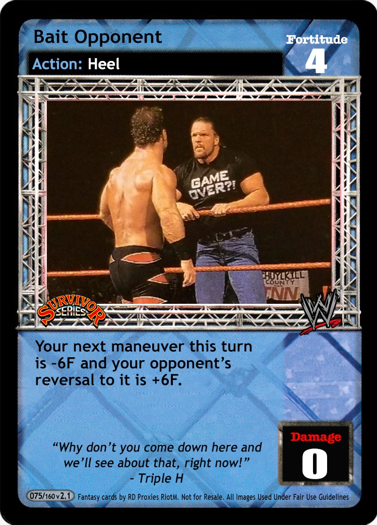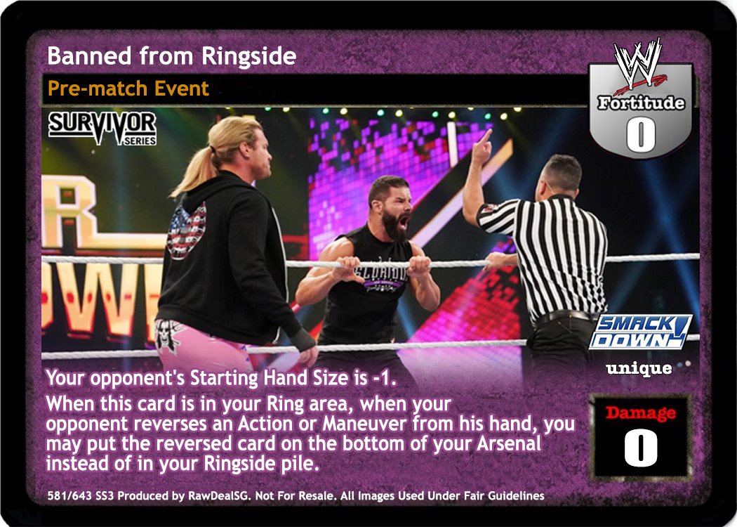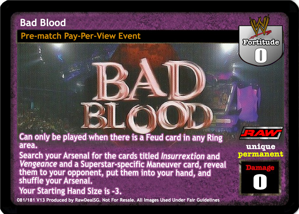 Can only be played when there is a Feud card in any Ring area. Search your Arsenal for the cards titled Insurrextion and Vengeance and a Superstar-specific Maneuver card, reveal them to your opponent, put them into your hand, and shuffle your Arsenal. Your Starting Hand Size is -3.
