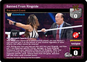 Your Mid-match Capacity is +1. ACE: When your maneuver is unsuccessfully played, you may discard 1 card and then put it on the bottom of your Arsenal regardless of other effects; this effect cannot be reversed. ACE: During your turn you may put this card into your Ringside, and then put 1 non-Superstar-specific Corner, Manager, or Guest Ringside Announcer from your opponent's Ring into his Ringside. When that card is a Corner, he may search his hand and Arsenal for up to 4 Superstar-specific cards, remove them from the game, and draw half that many cards (rounded down).