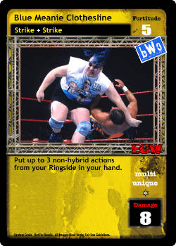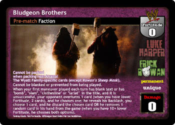 Can only be played when Bludgeon Brothers is in your Ring. As a maneuver, when played after a successfully played maneuver, it is Multi and cannot be reversed from Arsenal. Your opponent chooses 3 cards in his hand and then removes the rest from the game. As a reversal, this card is -10D, reverse any non-maneuver card.