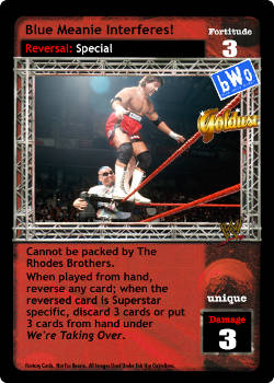 Cannot be packed by The Rhodes Brothers. When played from hand, reverse any card; when the reversed card is Superstar-specific, discard 3 cards or put 3 cards from hand under We're Taking Over.