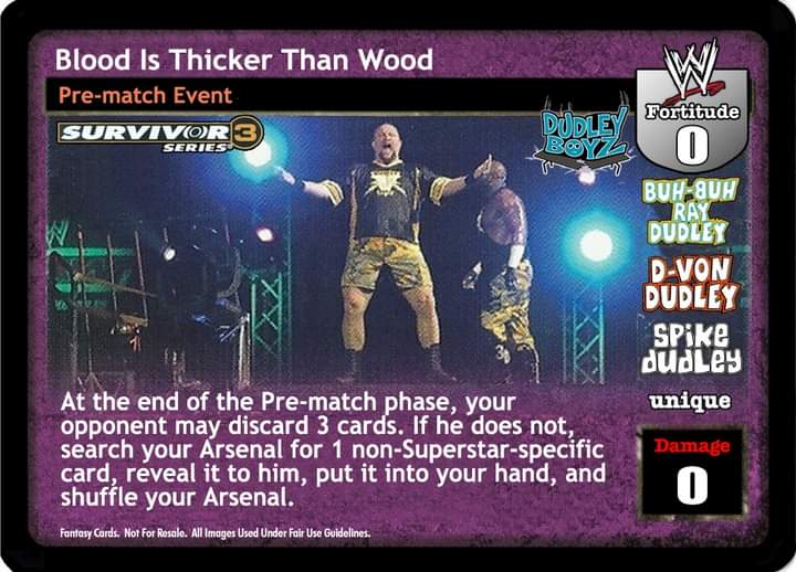 At the end of the Pre-match phase, your opponent may discard 3 cards. If he does not, search your Arsenal for 1 non-Superstar-specific card, reveal it to him, put it into your hand, and shuffle your Arsenal.