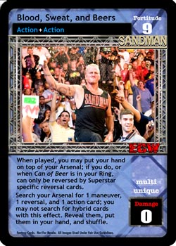 When played, you may put your hand on top of your Arsenal; if you do, or when Can of Beer is in your Ring, can only be reversed by Superstar-specific reversal cards. Search your Arsenal for 1 maneuver, 1 reversal, and 1 action card; you may not search for hybrid cards with this effect. Reveal them, put them in your hand, and shuffle.