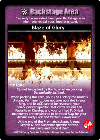 Cannot be packed by Doink, or when packing Dynamically Inclined. When packing this card, your The Luck of the Draw is Unique, Permanent, does not take up a slot in your Ring, and its ACE cannot be reversed; your non-Superstar-specific Heat cards are not Fan Favorite or Cheater, and your printed F: 0 Heat maneuvers are considered to be titled Slap for your Atomic Body Lock and Vertical Power Bomb. At the end of the Pre-match phase, Arsenal Search 6- non-Superstar specific printed Heat cards and discard them.