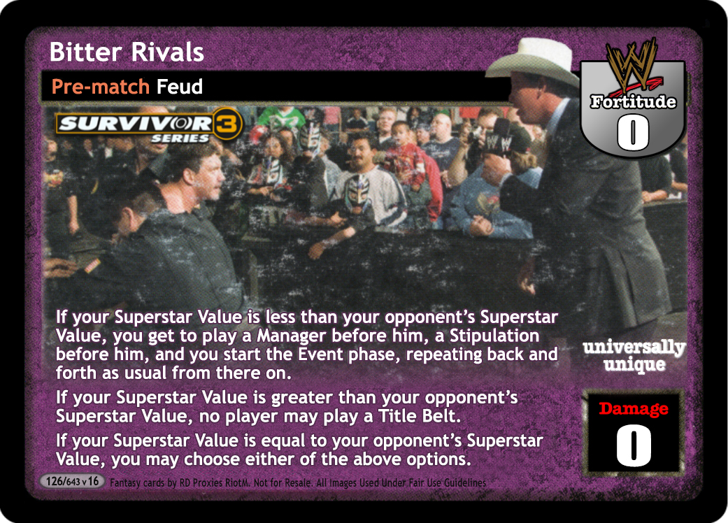 If your Superstar Value is less than your opponent's Superstar Value, you get to play a Manager before him, a Stipulation before him, and you start the Event phase, repeating back and forth as usual from there on. If your Superstar Value is greater than your opponent's Superstar Value, no player may play a Title Belt. If your Superstar Value is equal to your opponent's Superstar Value, you may choose either of the above options.