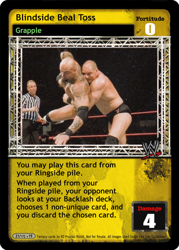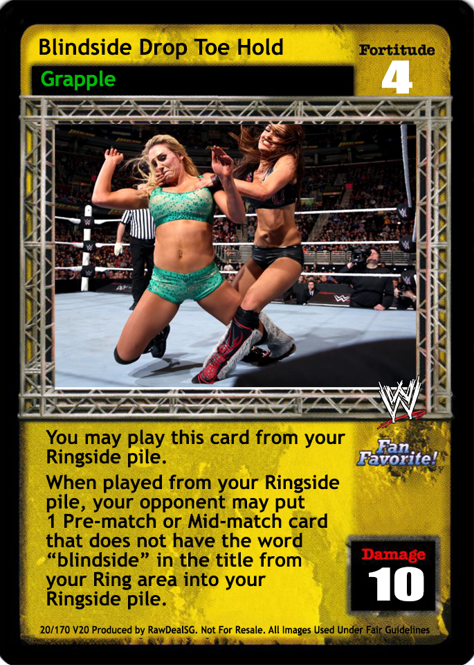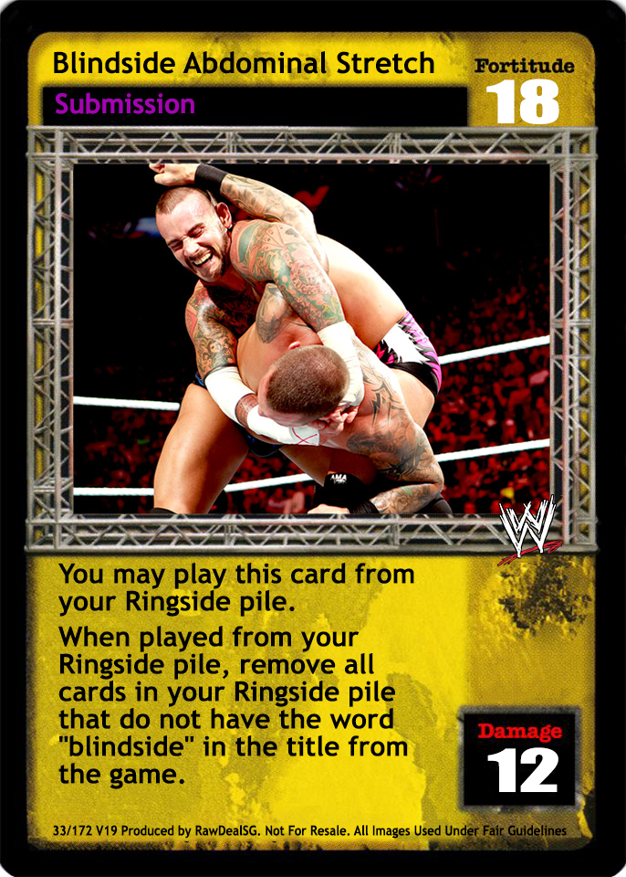 You may play this card from your Ringside pile. When played from your Ringside pile, remove all cards in your Ringside pile that do not have the word "blindside" in the title from the game.