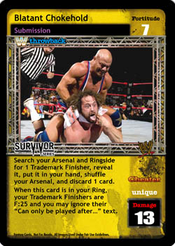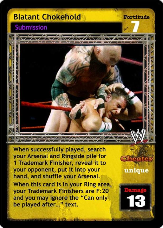 When successfully played, search your Arsenal and Ringside pile for 1 Trademark Finisher, reveal it to your opponent, put it into your hand, and shuffle your Arsenal. When this card is in your Ring area, your Trademark Finishers are F:20 and you may ignore the "Can only be played after..." text.