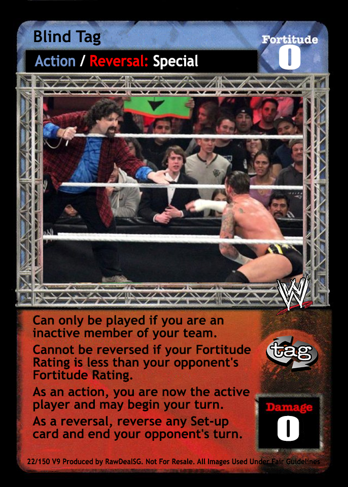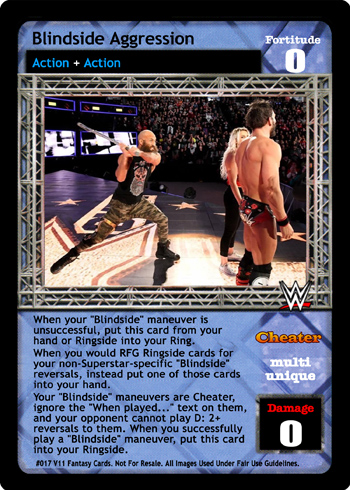 When your 'Blindside' maneuver is reversed, put this card from your hand or Ringside into your Ring. When you would remove cards in your Ringside for your non-Superstar-specific 'Blindside' reversals, instead put one of those cards into your hand. Your 'Blindside' maneuvers are Cheater, ignore the 'When played...' text on your maneuvers with the same title as a card under this card, and your opponent cannot play D: 2+ reversals to them. When it is successful, put this card into your Ringside.