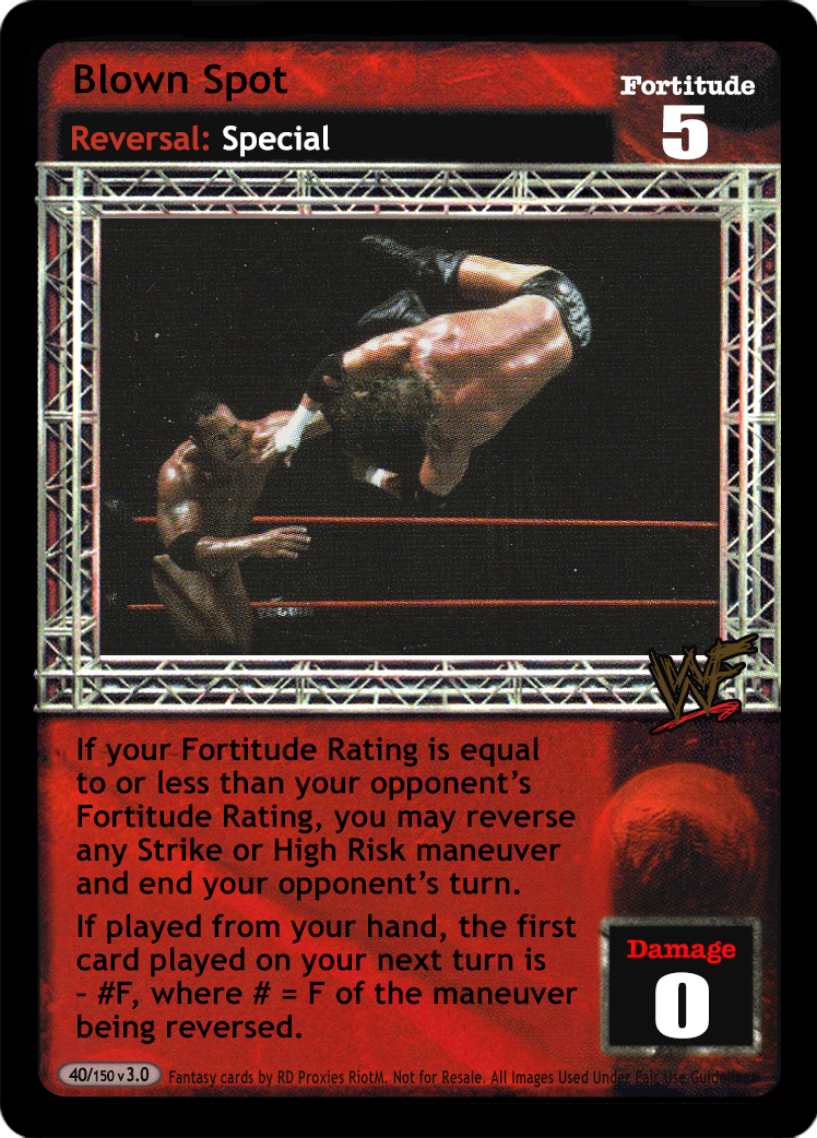 If your Fortitude Rating is equal to or less than your opponent's Fortitude Rating you may reverse any Strike or High Risk maneuver and end your opponent's turn. If played from your hand, the first card played on your next turn is - #F, where # = F of the maneuver being reversed.