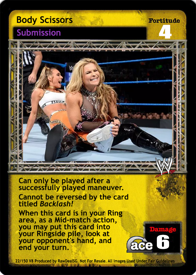 Can only be played after a successfully played maneuver. Cannot be reversed by the card titled Backlash! When this card is in your Ring area, as a Mid-match action, you may put this card into your Ringside pile, look at your opponent's hand, and end your turn.