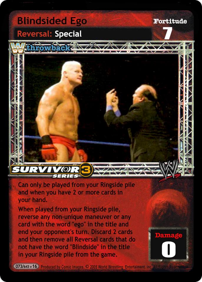 Can only be played from your Ringside pile and when you have 2 or more cards in your hand. When played from your Ringside pile, reverse any non-unique maneuver or any card with the word "ego" in the title and end your opponent's turn. Discard 2 cards and then remove all Reversal cards that do not have the word "Blindside" in the title in your Ringside pile from the game.