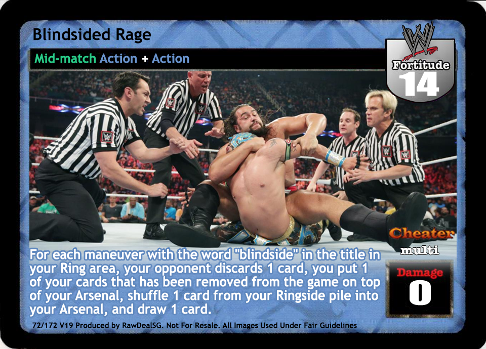 For each maneuver with the word "blindside" in the title in your Ring area, your opponent discards 1 card, you put 1 of your cards that has been removed from the game on top of your Arsenal, shuffle 1 card from your Ringside pile into your Arsenal, and draw 1 card.