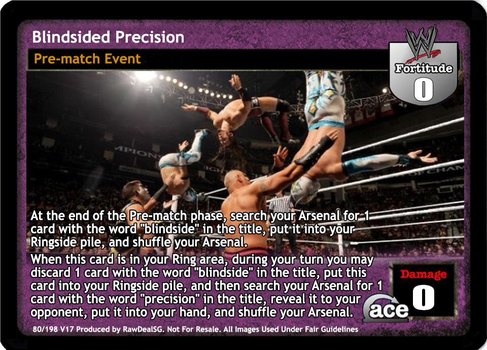 At the end of the Pre-match phase, search your Arsenal for 1 card with the word "blindside" in the title, put it into your Ringside pile, and shuffle your Arsenal. When this card is in your Ring area, during your turn you may discard 1 card with the word "blindside" in the title, put this card into your Ringside pile, and then search your Arsenal for 1 card with the word "precision" in the title, reveal it to your opponent, put it into your hand, and shuffle your Arsenal.