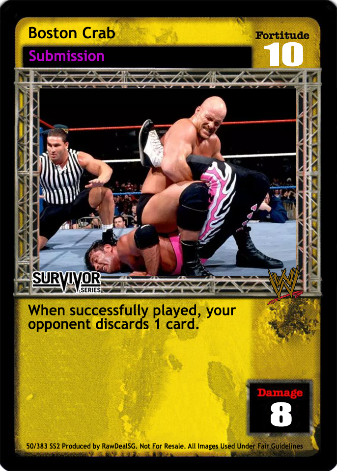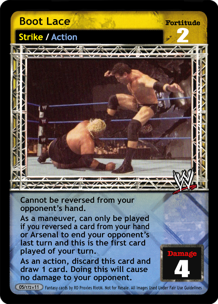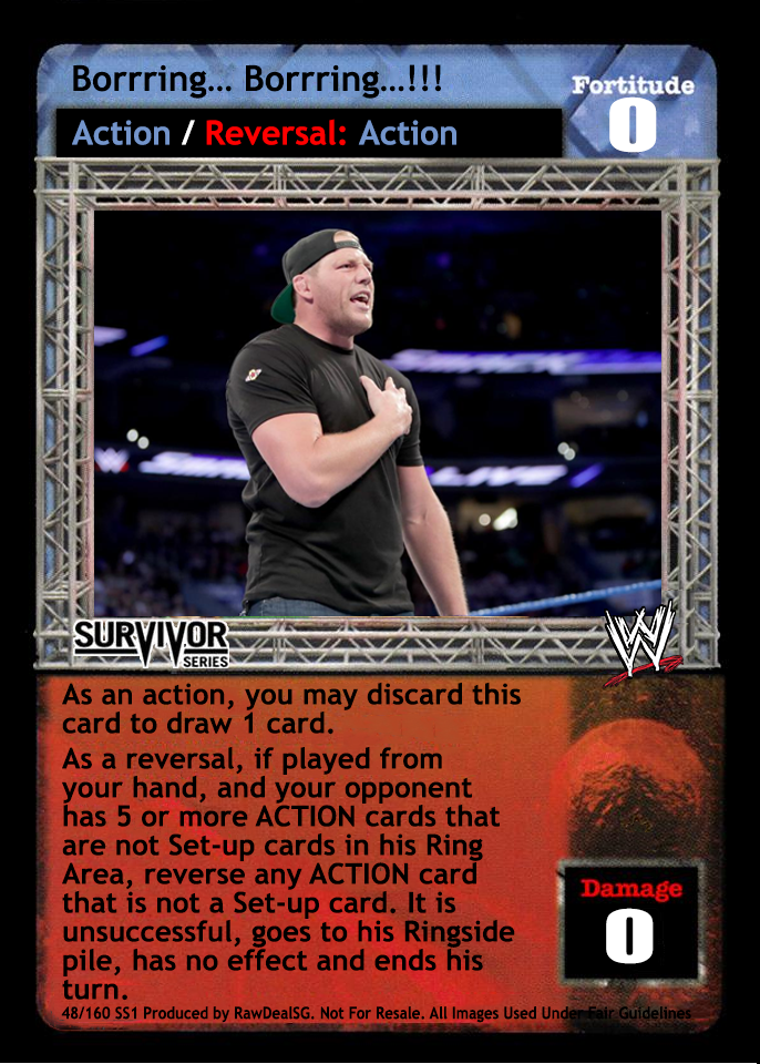 As an action, you may discard this card to draw 1 card. As a reversal, if played from your hand, and your opponent has 5 or more ACTION cards that are not Set-up cards in his Ring Area, reverse any ACTION card that is not a Set-up card. It is unsuccessful, goes to his Ringside pile, has no effect and ends his turn.
