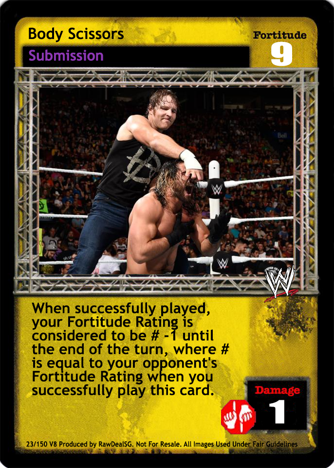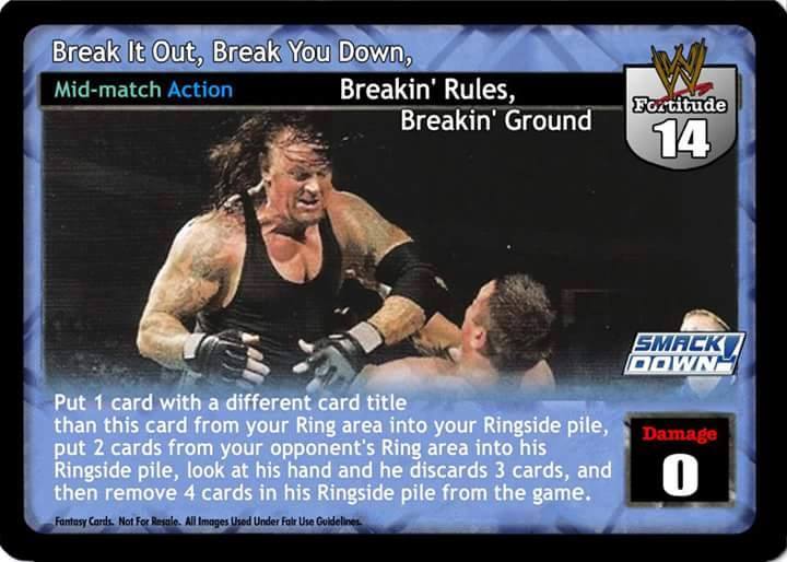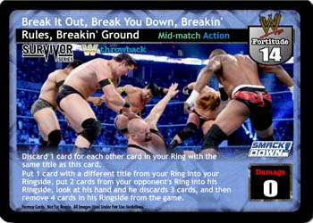 Discard 1 card for each other card in your Ring with the same title. Put 1 card with a different title from your Ring into your Ringside, put 2 cards from your opponent's Ring into his Ringside, look at his hand and he discards 3 cards, and then remove 4 cards in his Ringside from the game.