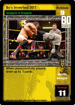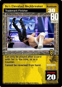Reveal this card when Bobby Fish is revealed. When Bobby Fish is hidden, hide this card. Your opponent's maneuvers are -1D, his Strike maneuvers are an additional -1D, and when you successfully play a Trademark Finisher you may Promo: 2. When you are Undisputed Era and your Fortitude is 30+, or when you are Bobby Fish, your Unique printed 15D+ Submissions are Trademark Finishers instead.