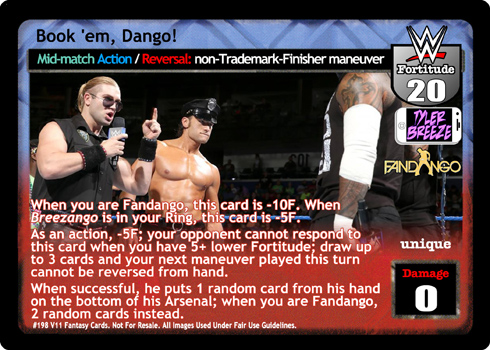 When you are Fandango, this card is -10F. When Breezango is in your Ring, this card is -5F. As an action, -5F; your opponent cannot respond to this card when you have 5+ lower Fortitude; draw up to 3 cards and your next maneuver played this turn cannot be reversed from hand. When successful, he puts 1 random card from his hand on the bottom of his Arsenal; when you are Fandango, 2 random cards instead.