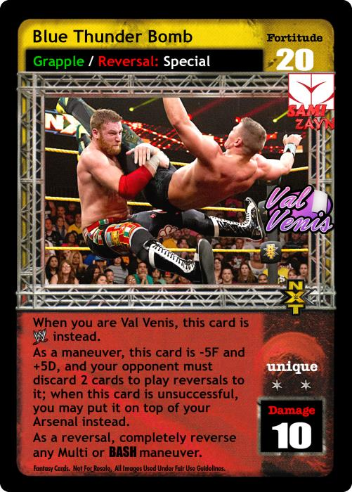 When you are Val Venis, this card is WWE instead. As a maneuver, this card is -5F and +5D, and your opponent must discard 2 cards to play reversals to it; when this card is unsuccessful, you may put it on top of your Arsenal instead. As a reversal, completely reverse any Multi or BASH maneuver.