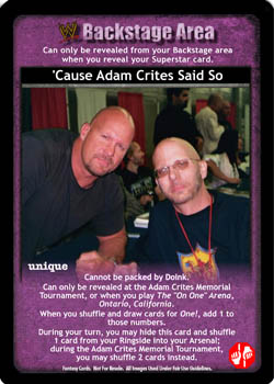 Cannot be packed by Doink. Can only be revealed at the Adam Crites Memorial Tournament, or when you play The 'On One' Arena, Ontario, California. When you shuffle and draw cards for One!, add 1 to those numbers. During your turn, you may hide this card and shuffle 1 card from your Ringside into your Arsenal; during the Adam Crites Memorial Tournament, you may shuffle 2 cards instead.