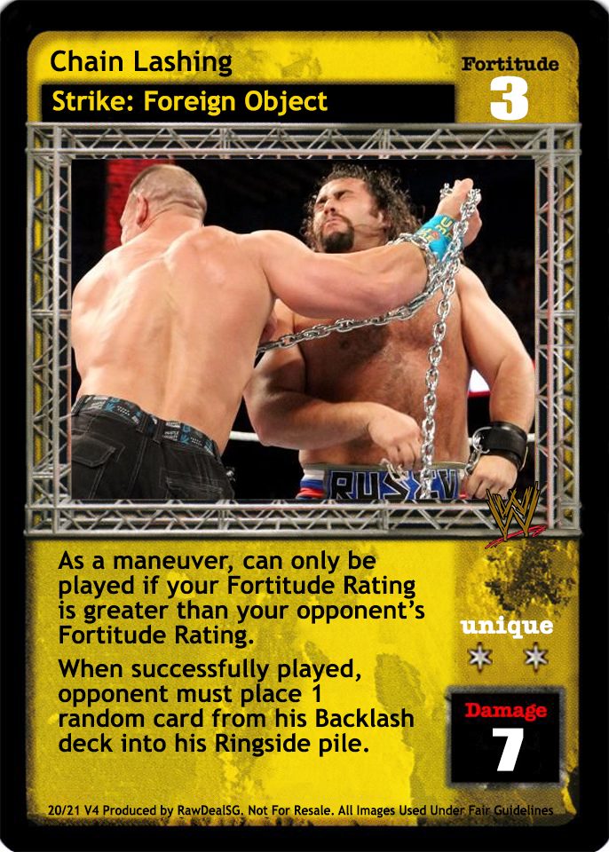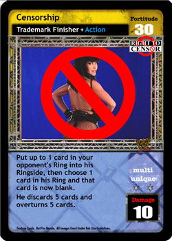 As a maneuver, can only be played if your Fortitude Rating is greater than your opponent's Fortitude Rating. When successfully played, opponent must place 1 random card from his Backlash deck into his Ringside pile.