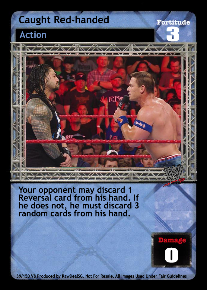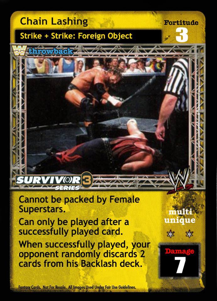 Cannot be packed by Female Superstars. Can only be played after a successfully played card. When successfully played, your opponent randomly discards 2 cards from his Backlash deck.