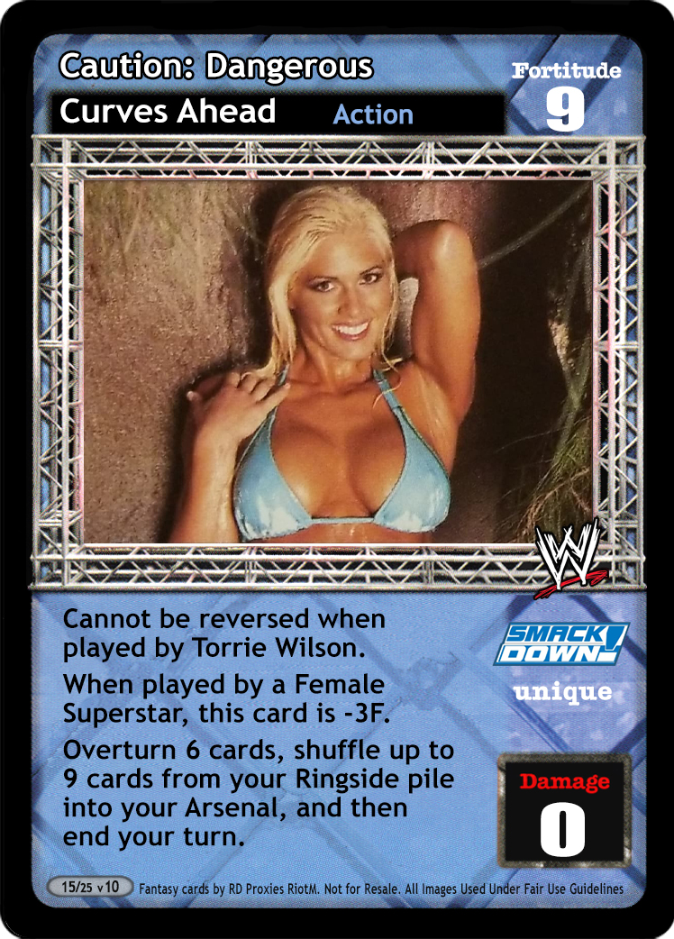 Cannot be reversed when played by Torrie Wilson. When played by a Female Superstar, this card is -3F. Overturn 6 cards, shuffle up to 9 cards from your Ringside pile into your Arsenal, and then end your turn.