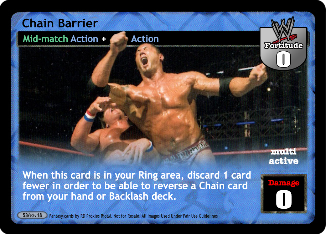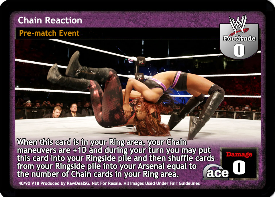 When this card is in your Ring area, your Chain maneuvers are +1D and during your turn you may put this card into your Ringside pile and then shuffle cards from your Ringside pile into your Arsenal equal to the number of Chain cards in your Ring area.