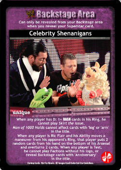 When any player has D: 1+ BASH cards in his Ring, he cannot play Skirt the Issue. Man of 1000 Holds cannot affect cards with 'leg' or 'arm' in the title. When any player is Ric Flair and his Ability moves a maneuver from his opponent's Ring, that player puts 2 random cards from his hand on the bottom of his Arsenal and overturns 2 cards. When any player is Test, he cannot play Factions without his logo, or reveal Backstage cards with 'Anniversary' in the title.