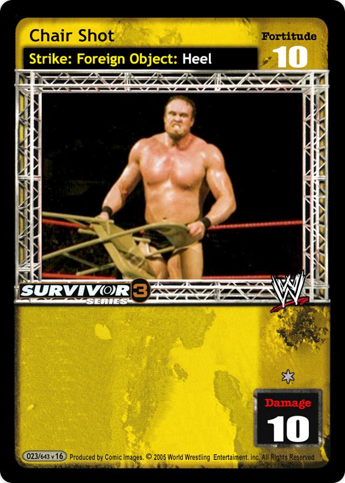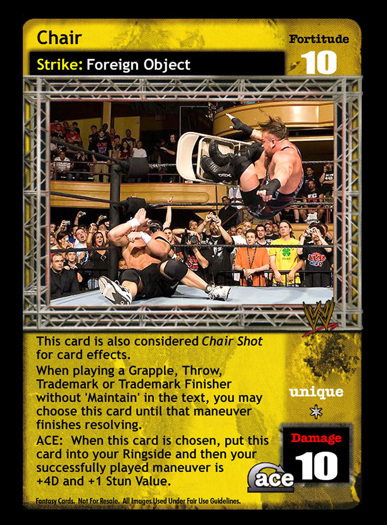 This card is also considered Chair Shot for card effects. When playing a Grapple, Throw, Trademark or Trademark Finisher without 'Maintain' in the text, you may choose this card until that maneuver finishes resolving. ACE: When this card is chosen, put this card into your Ringside and then your successfully played maneuver is +4D and +1 Stun Value.