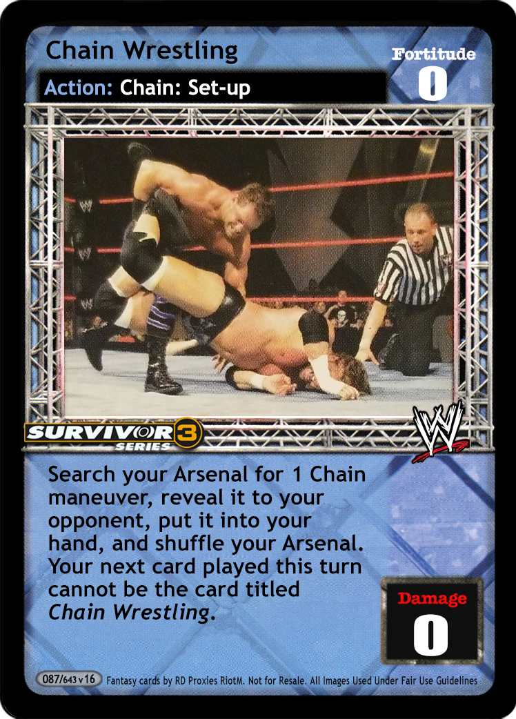 Search your Arsenal for 1 Chain maneuver, reveal it to your opponent, put it into your hand, and shuffle your Arsenal. Your next card played this turn cannot be the card titled Chain Wrestling.