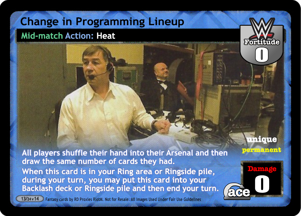 All players shuffle their hand into their Arsenal and then draw the same number of cards they had. When this card is in your Ring area or Ringside pile, during your turn, you may put this card into your Backlash deck or Ringside pile and then end your turn.