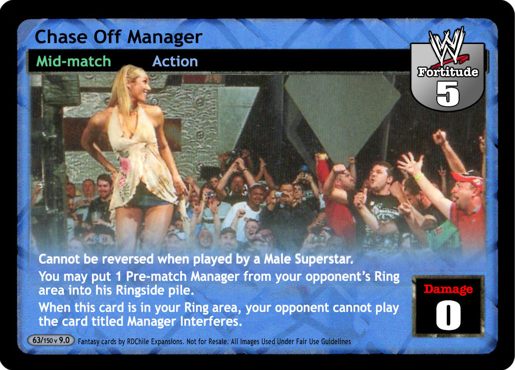 Cannot be reversed when played by a Male Superstar. You may put 1 Pre-match Manager from your opponent's Ring area into his Ringside pile. When this card is in your Ring area, your opponent cannot play the card titled Manager Interferes.
