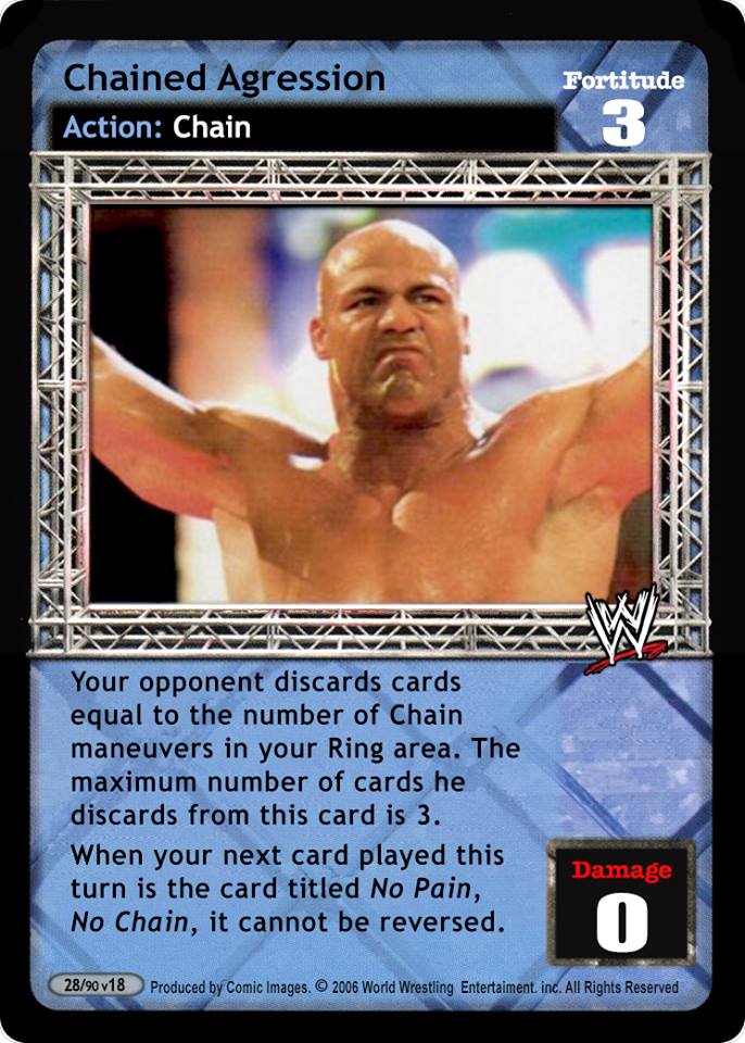 Your opponent discards cards equal to the number of Chain maneuvers in your Ring area. The maximum number of cards he discards from this card is 3. When your next card played this turn is the card titled No Pain, No Chain, it cannot be reversed.